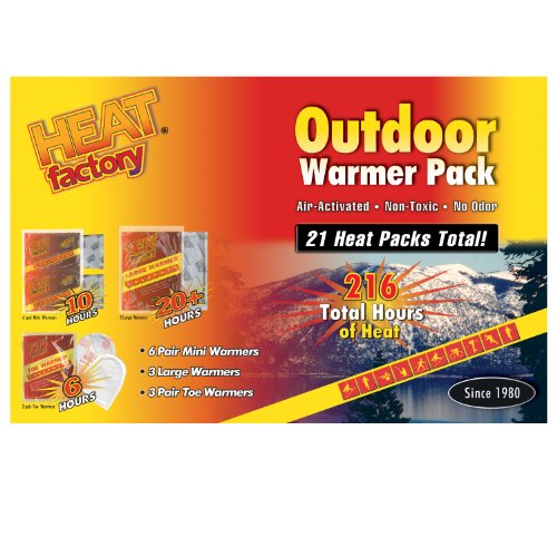 The ideal 3-day combination pack for any outdoor adventure. The Heat Factory Outdoor Warmer Pack offers 6 pair Hand Warmer, 3 pair Toe Warmers, and 3 Large Warmers to keep you playing outdoors all weekend long. High-quality warmers are safe, odorless and non-toxic. The Heat Factory warmer is a soft, lightweight pouch containing a biodegradable mixture of iron powder, charcoal, salt, sawdust and vermiculite. When exposed to the air, an oxidation process takes place that generates heat. Heat Factory warmers are specially engineered to provide heat that is long-lasting, comfortable, and even. Heat Factory continually tests its products to ensure that you receive only the highest quality warmers that will consistently deliver warmth as advertised. Once activated, Heat Factory warmers can even be saved for later use (preferably within a week) if placed in an airtight container. Unopened, the Heat Factory warmer has a shelf life of three years or more.